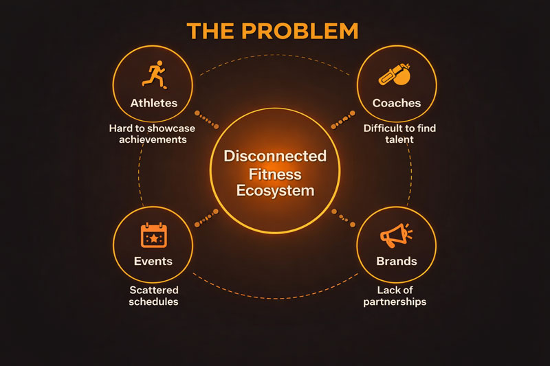 People in the fitness ecosystem lack a structured environment to connect and find opportunities. Existing social platforms are not designed for professional visibility, results tracking or event discovery.
